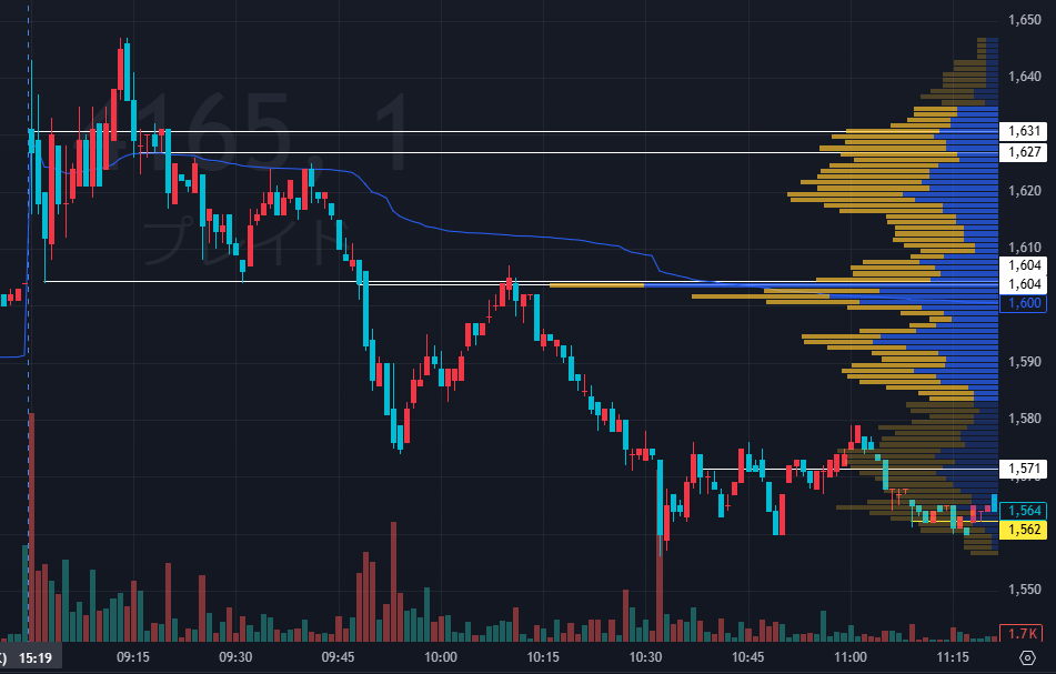 - 寄り前は少々GUでしたが気配が良かったので寄成エントリー。しかしすぐに下落。前日終値1,604円で指値をしておいたら見事に刺さり、反発。上昇し含み益出ていましたが、更なる上昇を期待してここはスルー。下落しVWAPでの反発狙いでナンピン。その後はVWAP下で推移し再度前日終値反発を期待し1,604円で指値。しかしその後ガラって更に下へ。10:30頃1,556円の安値を付け反発してきたところでナンピン。しかしその後も上昇せず下落したところで損切り。その後更なるガラが待っていたので、助かったけど、ひどいトレードでした。寄成→前日終値でナンピン→上昇 とここまでは良かった。ここで利確すべきでした。その後もVWAP割れや前日終値割れガラなど損切りポイントは何度もあったのに損切りできませんでした。1,604円は大きな出来高だまりでもあるのでその強い和ポートラインを割った段階で損切りできないと今後が厳しい。反省だらけのトレードでした