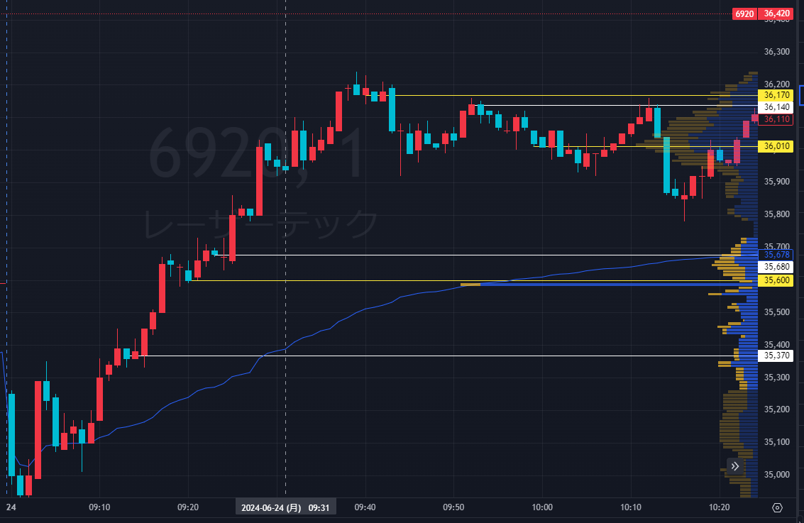- 寄付きGDでしたがUNDER強すぎたのでGD陽線に期待して寄成エントリー。一度押したところで利確。2度目は再度の上昇を確認してからエントリーし、上値重たくなったところで利確。それ以降も短期間のエントリーで少しずつ利益を獲得。何度も出し入れして16万弱の利益。寄成で入って9:29のピーク後の\22,000で売ってたとしたら25.6万円。今日来てる銘柄だと思ったらピークアンドボトムでしっかりチャートを見続ける方が良さそうなので、次回以降に活かしていきたい